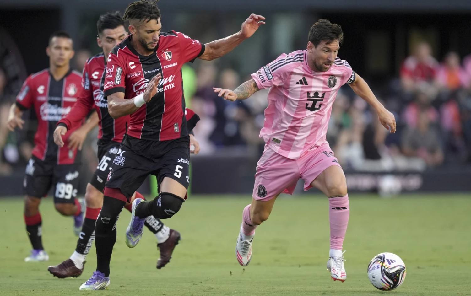 Inter Miami forward Lionel Messi, right, is pursued by Atlas defender Doria (5) during the first half of a Leagues Cup group stage soccer match, Wednesday, July 30, 2025, in Fort Lauderdale, Fla (AP)