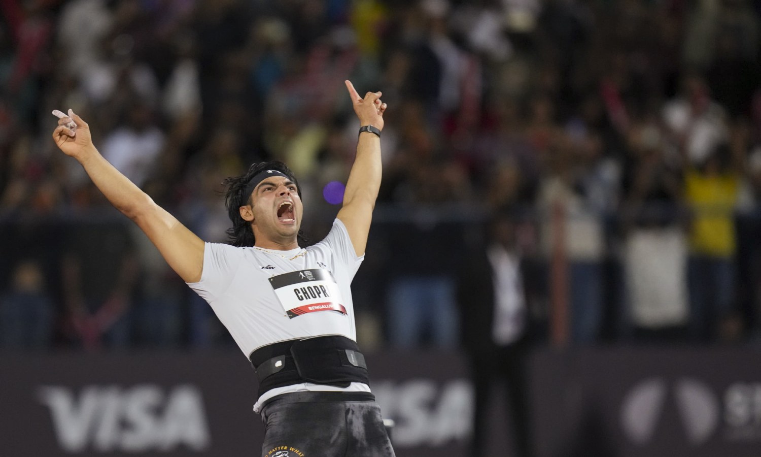 India's Neeraj Chopra celebrates as he competes in the Neeraj Chopra Classic 2025 international javelin competition, in Bengaluru, Karnataka, Saturday, July 5, 2025 (PTI)