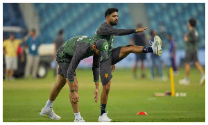 Pakistan's Haris Rauf and Shaheen Shah Afridi warm up before the start of the Asia Cup cricket match between Pakistan and United Arab Emirates at Dubai International Cricket Stadium, United Arab Emirates (PTI)