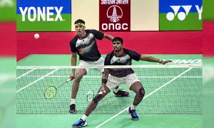 Indian badminton players Chirag Shetty and Satwiksairaj Rankireddy in action (Photo Credit: PTI)