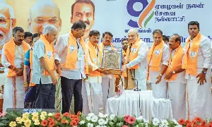 Union Home Minister and senior BJP leader Amit Shah receiving a memento from state party leaders at a meeting with office-bearers in Chennai on Sunday