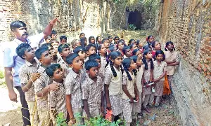 Students take a look at the inner portion of the ancient Sethupathi Palace at Tiruppullani on Tuesday