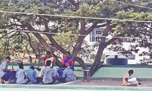 Due to a lack of adequate classrooms, the students were forced to sit under the shade of trees on the ground and as well as on the terrace of the building.