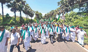 Farmers taking a rally to the Tiruvarur Collectorate on Tuesday