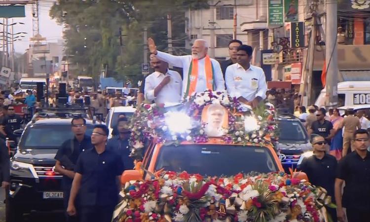 PM's roadshow is held with non-stop chants of 'Modi, Modi' by BJP workers and the playing of traditional music to welcome him.