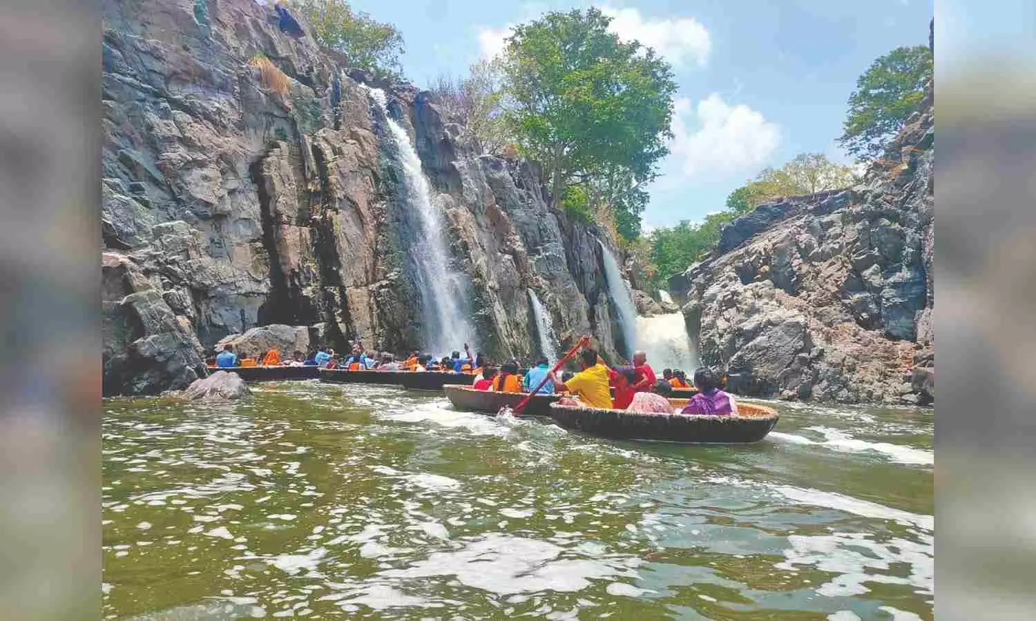 Tourists taking a coracle ride in Hogenakkal on Sunday