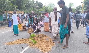 Irate farmers from the area, particularly from Kattur and Nayakkarkottai, carried the sprouted stocks and staged a road block protest at Thanjavur-Mannargudi Highway and dumped the paddy on the road, resulting in a traffic snarl on the highway.