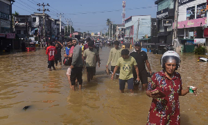 People wade through a submerged area of Colombo, Sri Lanka, following flooding on Sunday (AP)