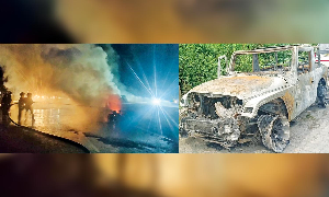 Fire Service personnel dousing the fire that gutted the vehicle (above) while it was proceeding on the national highway