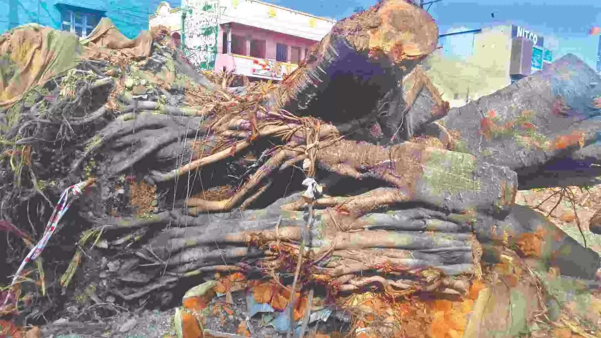 The felled 70-year-old banyan tree in Ranipet district