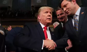 U.S. President Donald Trump is greeted by Rep. Mike Johnson (R-LA) as he arrives to deliver his State of the Union address to a joint session of the U.S. Congress in the House Chamber of the U.S. Capitol (Reuters)