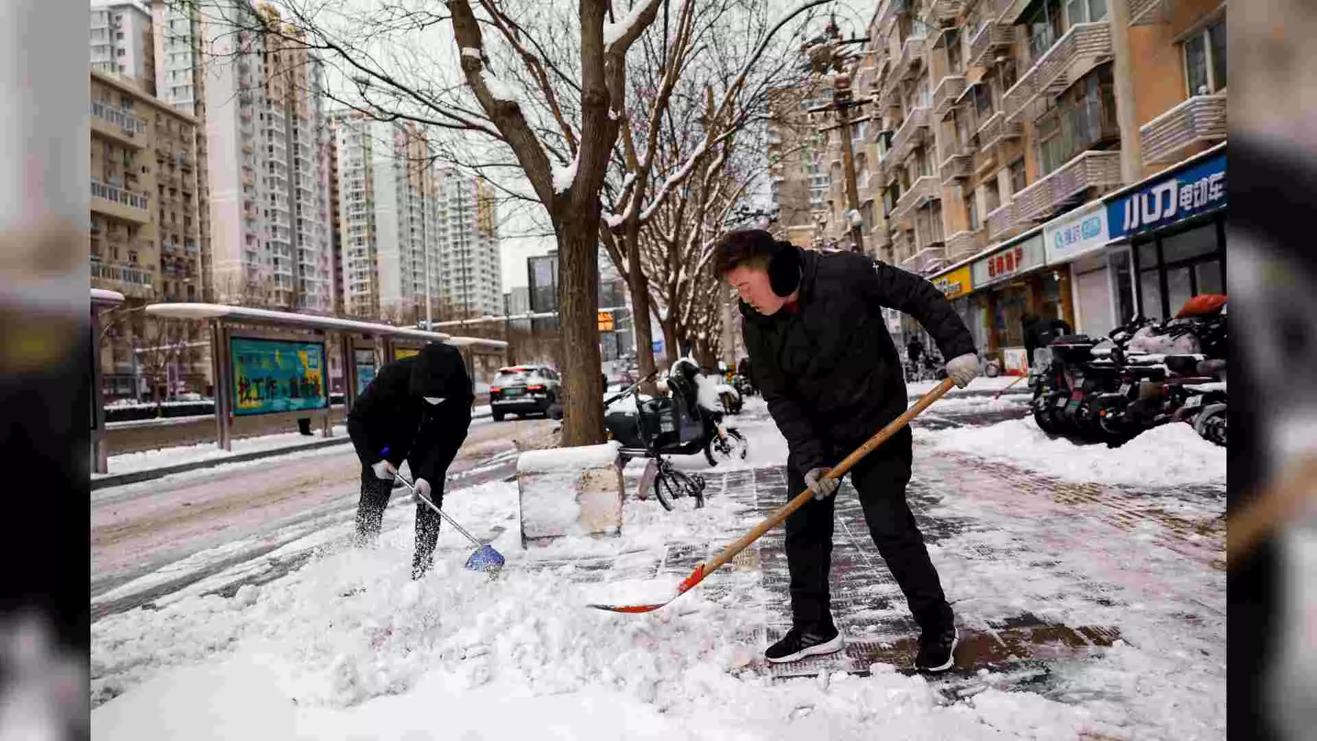 Workers clear snow off a pedestrian road following snowfall in Beijing, China (Photo/Reuters)