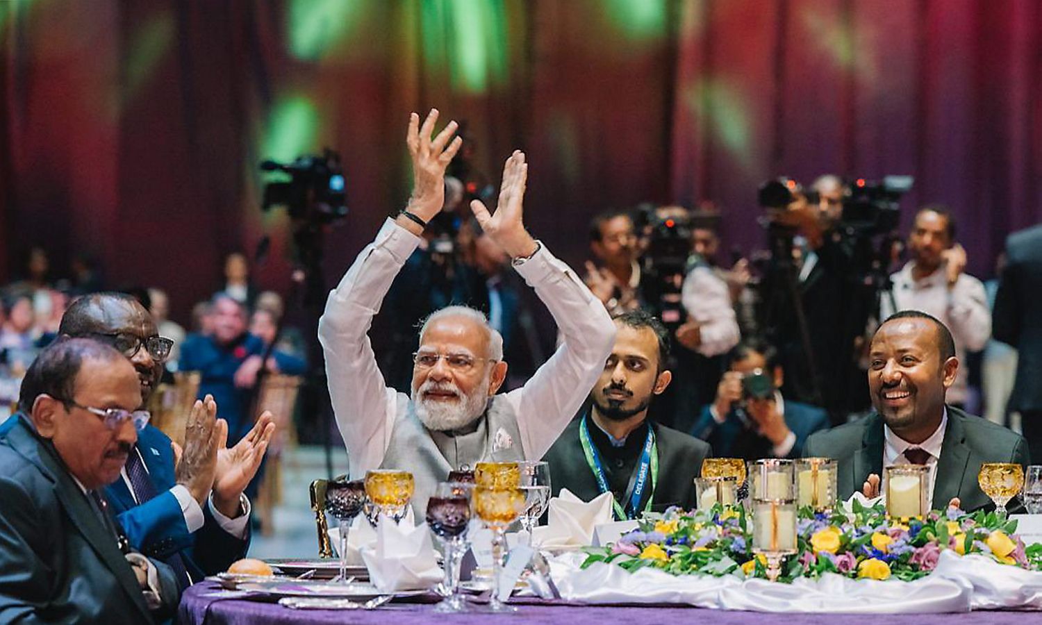 The prime minister and members of the Indian delegation are seen clapping enthusiastically with their hands raised overhead.