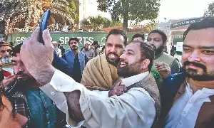 A candidate backed by Imran’s party poses for a selfie with supporters following his victory.