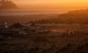A formation of Israeli tanks is positioned near Israel's border with the Gaza Strip (Image: REUTERS)