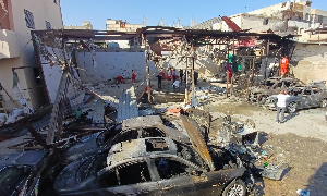 At the scene of the strike, paramedics searched for human remains around a wall that was stained with blood. Several cars were burnt and broken glass and debris littered the ground.