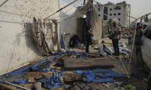 Palestinian inspect the destroyed tent where journalists, including Al Jazeera correspondents Anas al-Sharif and Mohamed Qureiqa (AP)