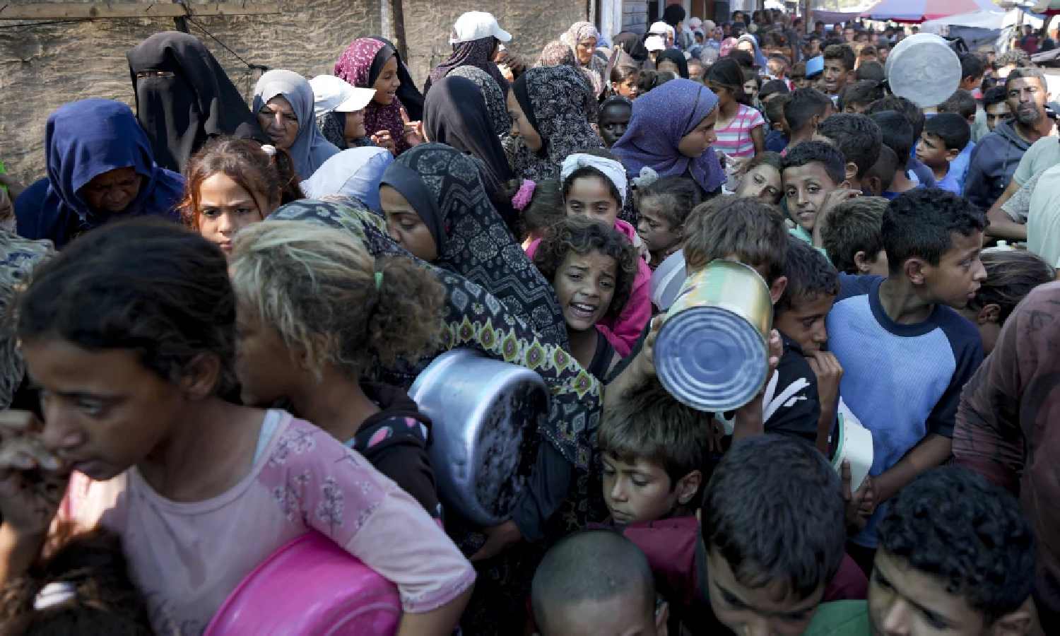 Palestinians line up for food distribution in Deir al-Balah, Gaza Strip