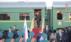 According to the sources, Kim's olive green, bulletproof train appears headed toward the Russian city of Komsomolsk-on-Amur, where he will visit an aircraft factory, following his meeting with Putin held on Wednesday at the Vostochny spaceport where he pledged full support for Russia, reports Yonhap News Agency.
