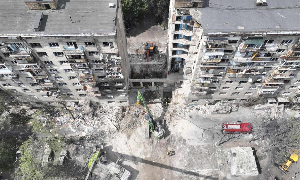 Kyiv authorities declared Wednesday an official day of mourning. Mourners laid flowers on swings and slides at a playground across the street from the collapsed building. On Tuesday, a man had waited hours there for his 31-year-old son's body to be pulled from the rubble.