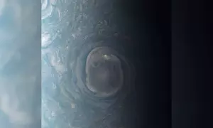Juno captured the view as it completed its 31st close flyby of Jupiter on December 30, 2020. The image shows a vortex near Jupiter's north pole.