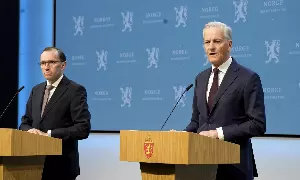 Norway's Prime Minister Jonas Gahr Store (R) with Foreign Minister Espen Barth Eide (L), speaks during a news conference in Oslo, Norway on Wednesday (AP)