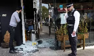 A vandalised Kosher restaurant near a bridge with 'Free Palestine' painted on it, in Golders Green, London (Photo: Reuters)