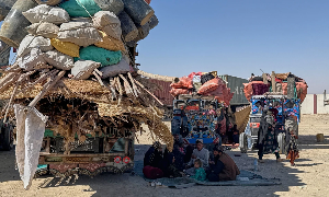 Afghan refugees sit next to their belongings loaded onto vehicles as they wait for opening of the border crossing point, which closed following Afghan and Pakistani security forces exchanged cross border firing, at a camp in Charnan, Pakistan, Sunday, Oct. 12, 2025. (AP Photo)