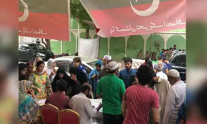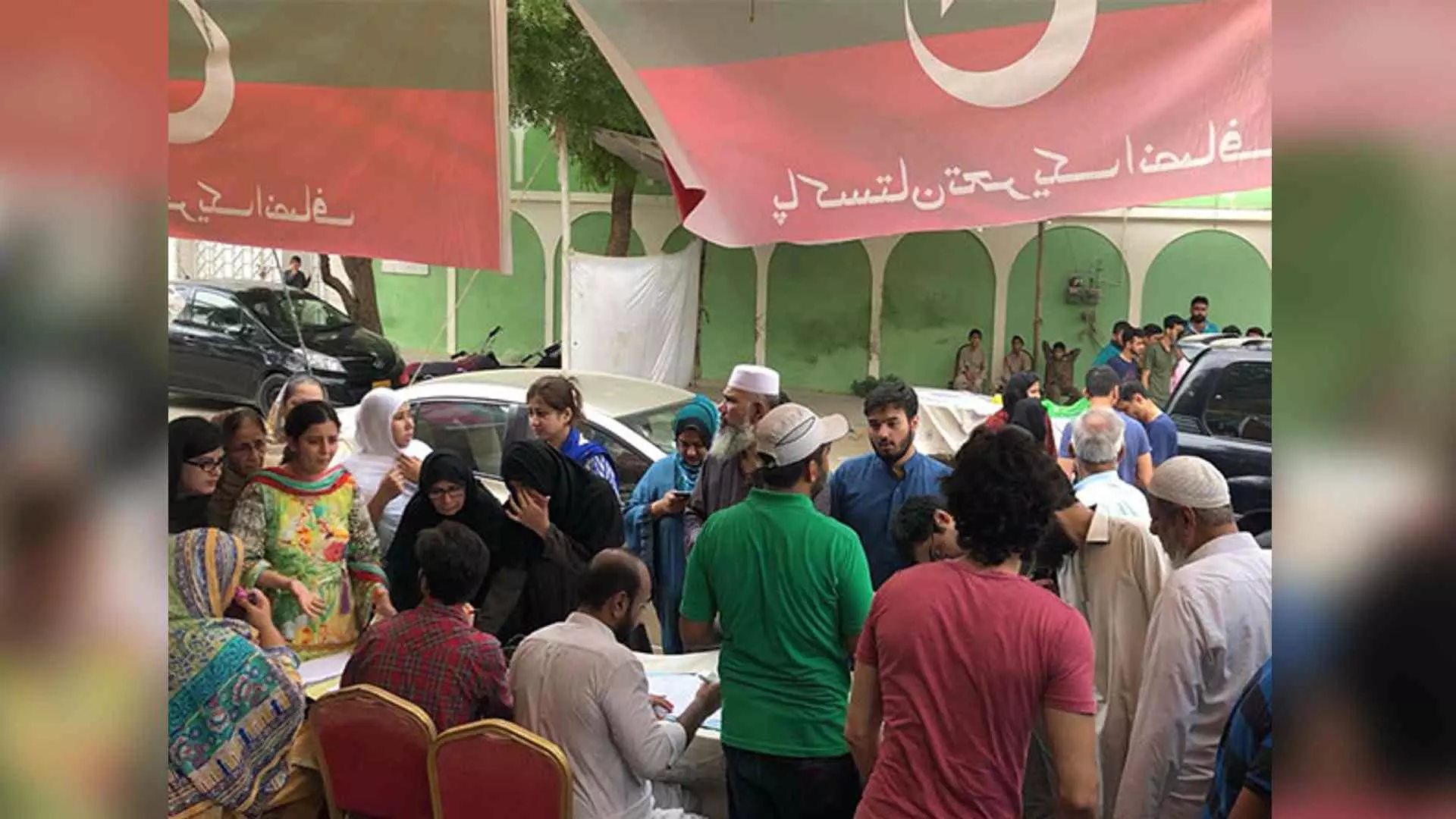 Voters queue up at a PTI bench near the voting centre (X/@PTIofficial)