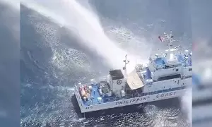 MANILA: Philippines on Tuesday accused the China Coast Guard fired water cannons at two of its vessels, causing damage to one of them, during a patrol near the hotly contested Scarborough Shoal in the South China Sea. It accused China of "dangerous maneuvers and obstruction" and reinstalling a barrier at the disputed Scarborough Shoal, which Beijing blockaded and seized from Manila in 2012, reported Al Jazeera.