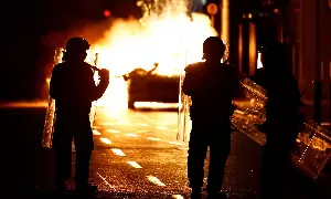 Riot police stands next to a burning police vehicle, near the scene of a suspected stabbing that left few children injured in Dublin, Ireland (Photo: Reuters)