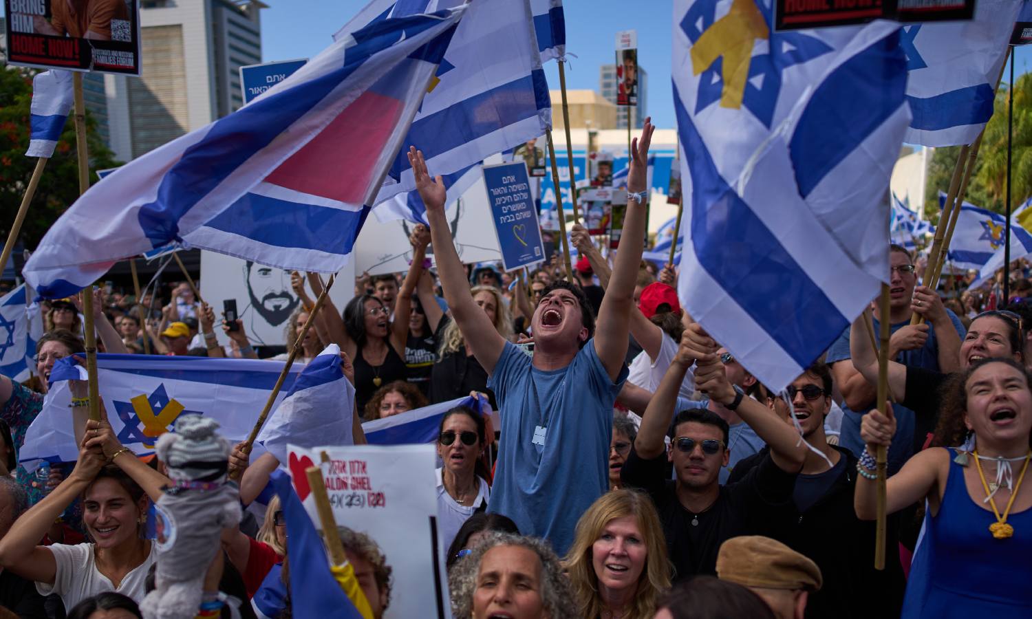 People react as they watch a live broadcast of Israeli hostages released from Hamas captivity in the Gaza Strip, at a plaza known as hostages square in Tel Aviv, Israel, Monday, Oct. 13, 2025 (AP)