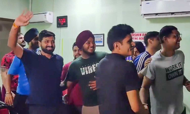 People celebrate at the academy of Abhishek Rana, coach of sports shooter Sarabjot Singh, after Singh won the bronze medal in the 10m air pistol mixed team event