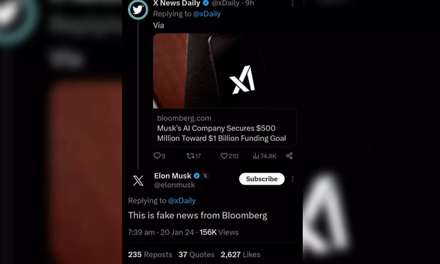 However, Elon Musk dismissed the report, saying, "This is fake news from Bloomberg", in response to a user who shared the news article on X.